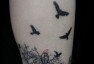 哇图网>腿部纹身图片>腿部经典流行的图腾树小鸟纹身图片