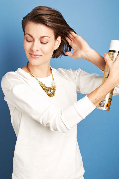 点击大图看下一张:用双手把头发都理到耳后,此时如果感觉头发还不够服帖,可以再喷多些发胶即可。