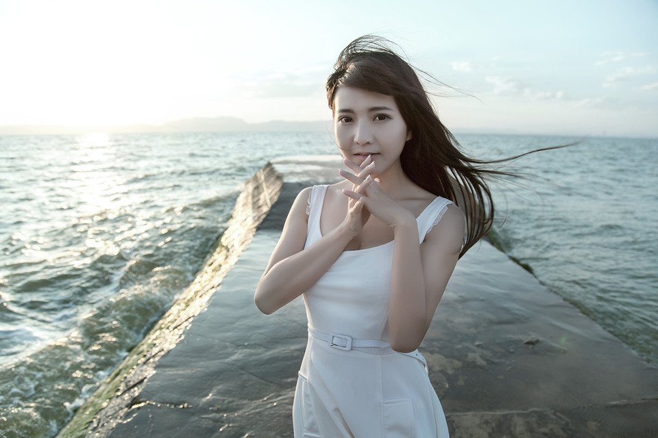 哇图网>甜美美女图片>海边长发飘逸少女甜美动人写真