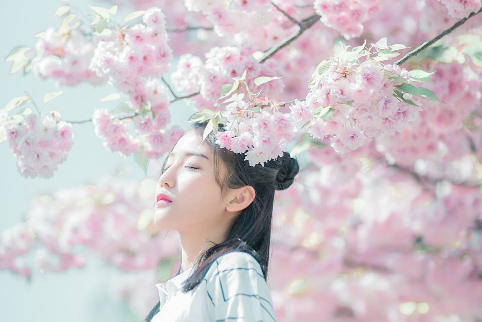 哇图网>白皙美女图片>白皙眼镜少女鲜花树下优美写真清新淡雅