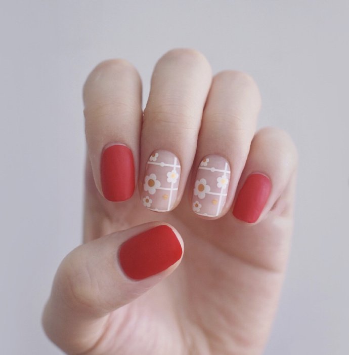 韩国小清新简单的裸色搭配白色小菊花图案美甲款式