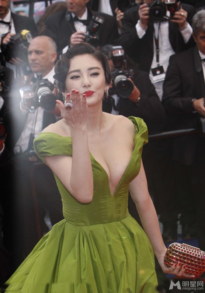 哇图网>明星张雨绮图片>张雨绮戛纳红毯深V绿裙 微笑飞吻性感来袭