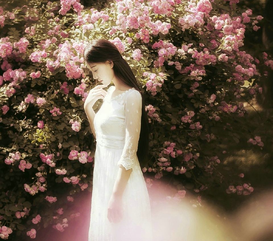 哇图网>白纱美女图片>花朵中的白纱恬静温婉女神迷人