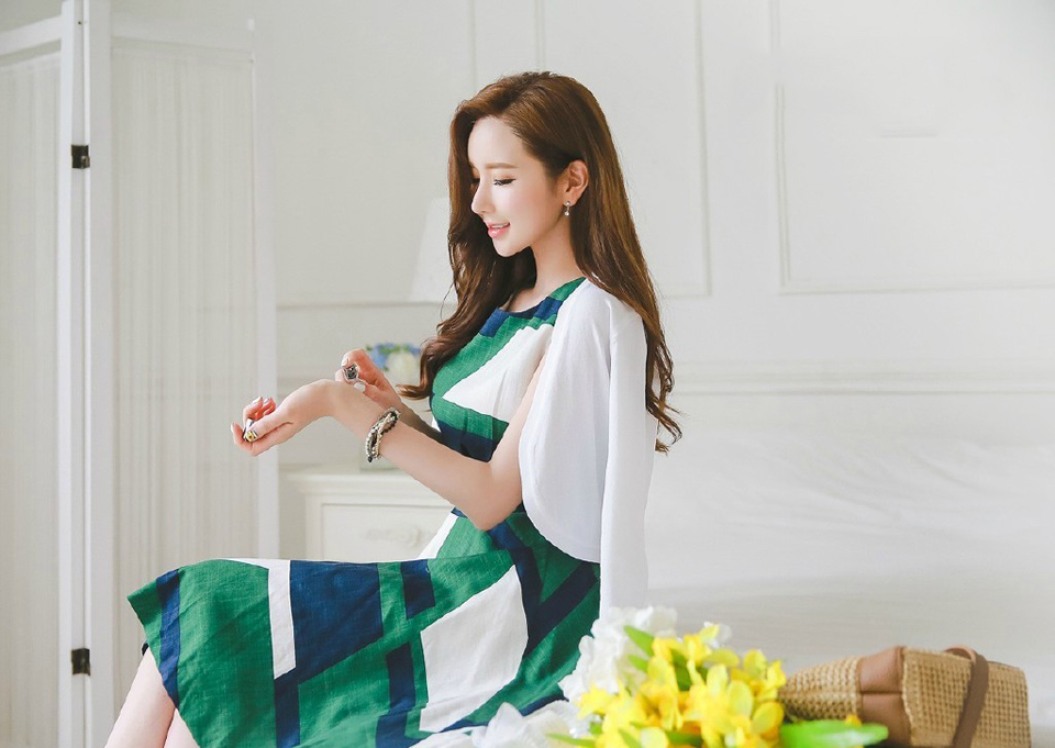 哇图网>白皙美女图片>白皙绿裙长腿模特私房写真气质优雅