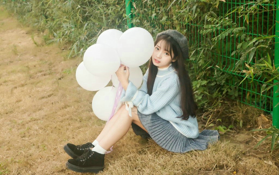 哇图网>毛衣纯真可人美女图片>户外气球娇萌贝雷帽毛衣妹子纯真动人
