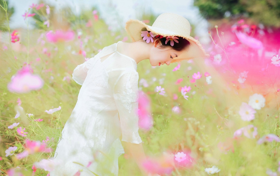 哇图网>气质美女图片>郊外花海中的气质端庄典雅美女