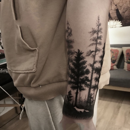 森林树木纹身图案_一组手臂上黑灰树木森林纹身图案作品(17)