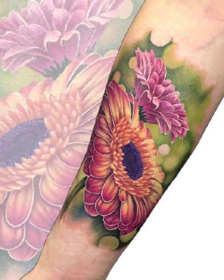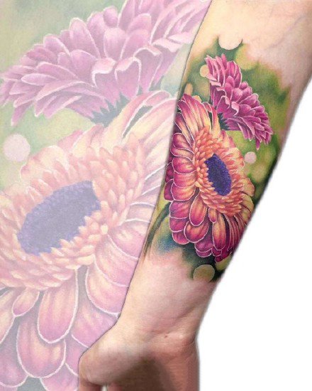 哇图网>花朵纹身图片>小手臂上的一组粉红色花朵纹身作品图片