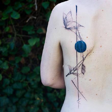 一组线条图案与蓝色圆形结合纹身作品