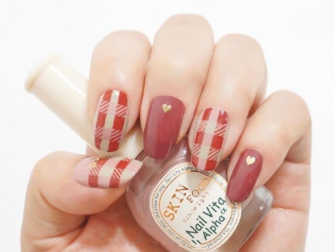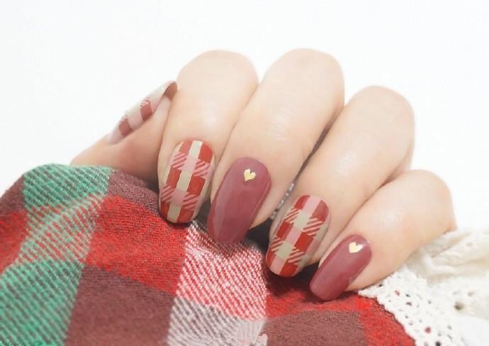 DIY温柔红豆沙格子美甲图片欣赏(7)
