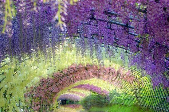 哇图网>紫藤花图片>日本北九州河内藤园的紫藤隧道,太美了