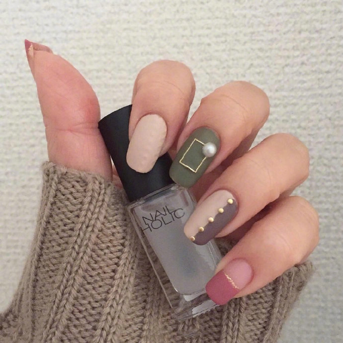 哇图网>秋冬美甲图片>配色超级秋冬感的美甲look,抹茶绿色好好看